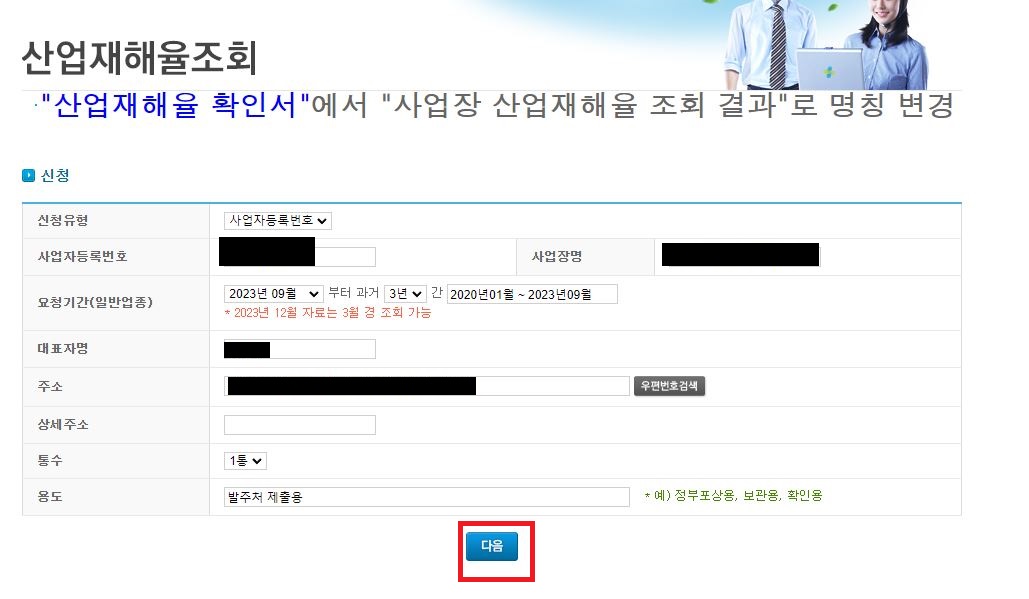 산업재해율 조회 신청화면에서 해당하는 사업자 정보를 입력해주고