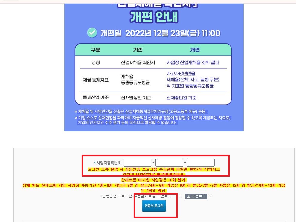 그러면 맨 상단에 '산업재해율 조회' 라는 버튼이 있는데 이걸 클릭하면 로그인 하라고 창이 전환됩니다.