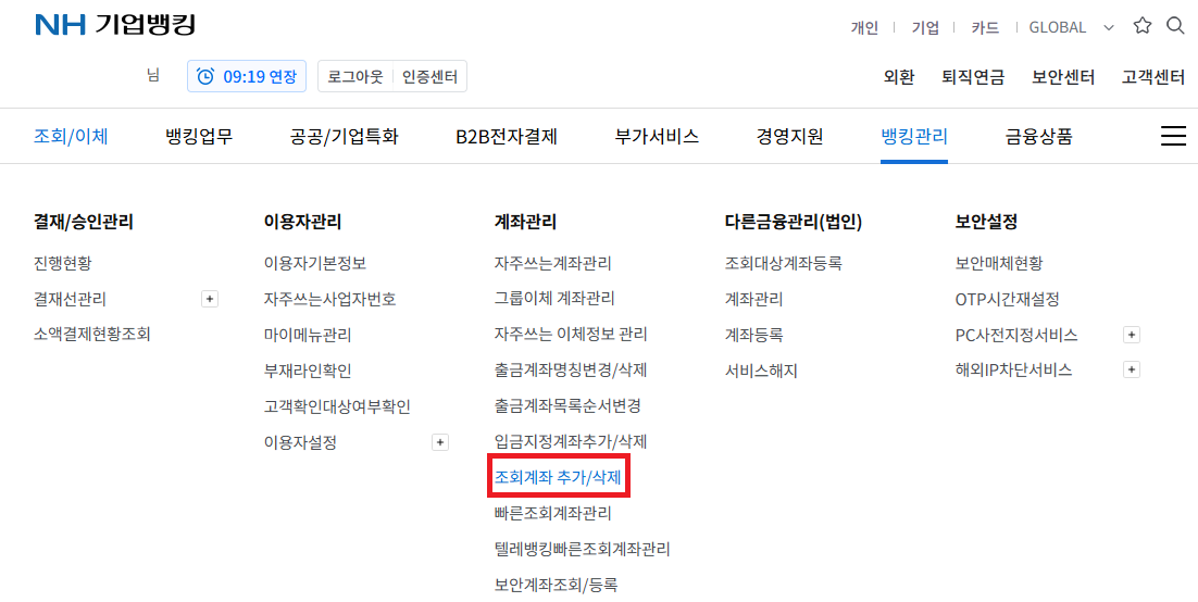 맨 위 상단 바 "뱅킹관리 " 클릭 계좌관리 ->조회계좌 추가/삭제를 클릭해줍니다.