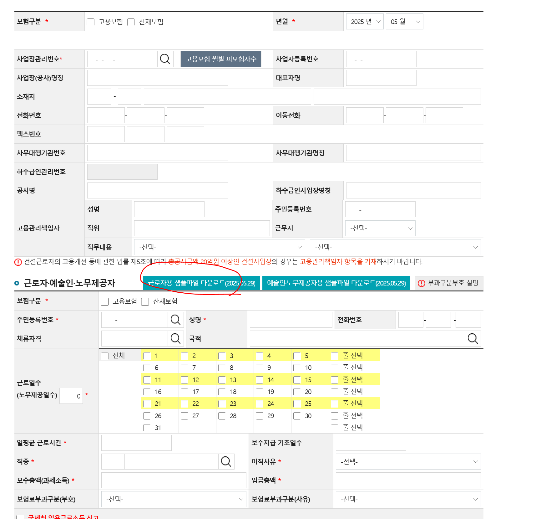 25.05월 일용근로내용신고 하려고 들어가보니까 근로자용 샘플파일 양식이 2025.05.29일자로 변경되었다고
