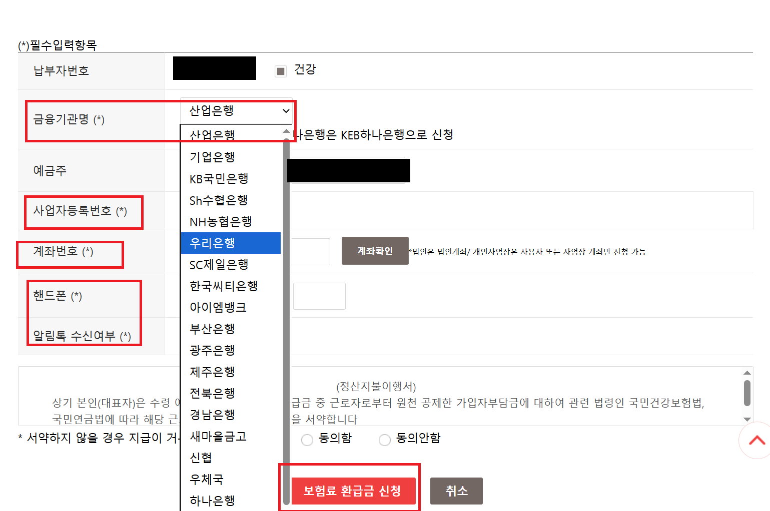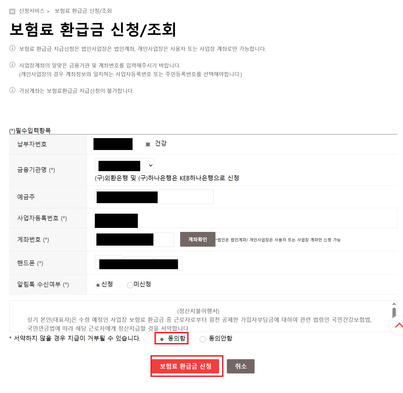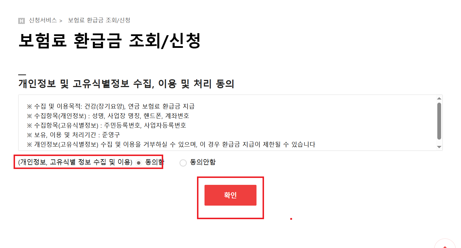 2. 그리고 나서 개인정보 및 고유식별정보 수집.이용 및 처리동의에 "동의함" 눌러주고 [확인] 버튼을 클릭해줍니다.