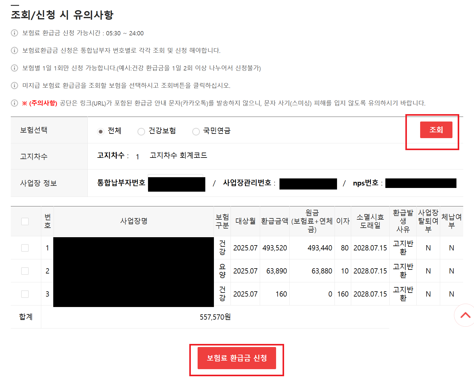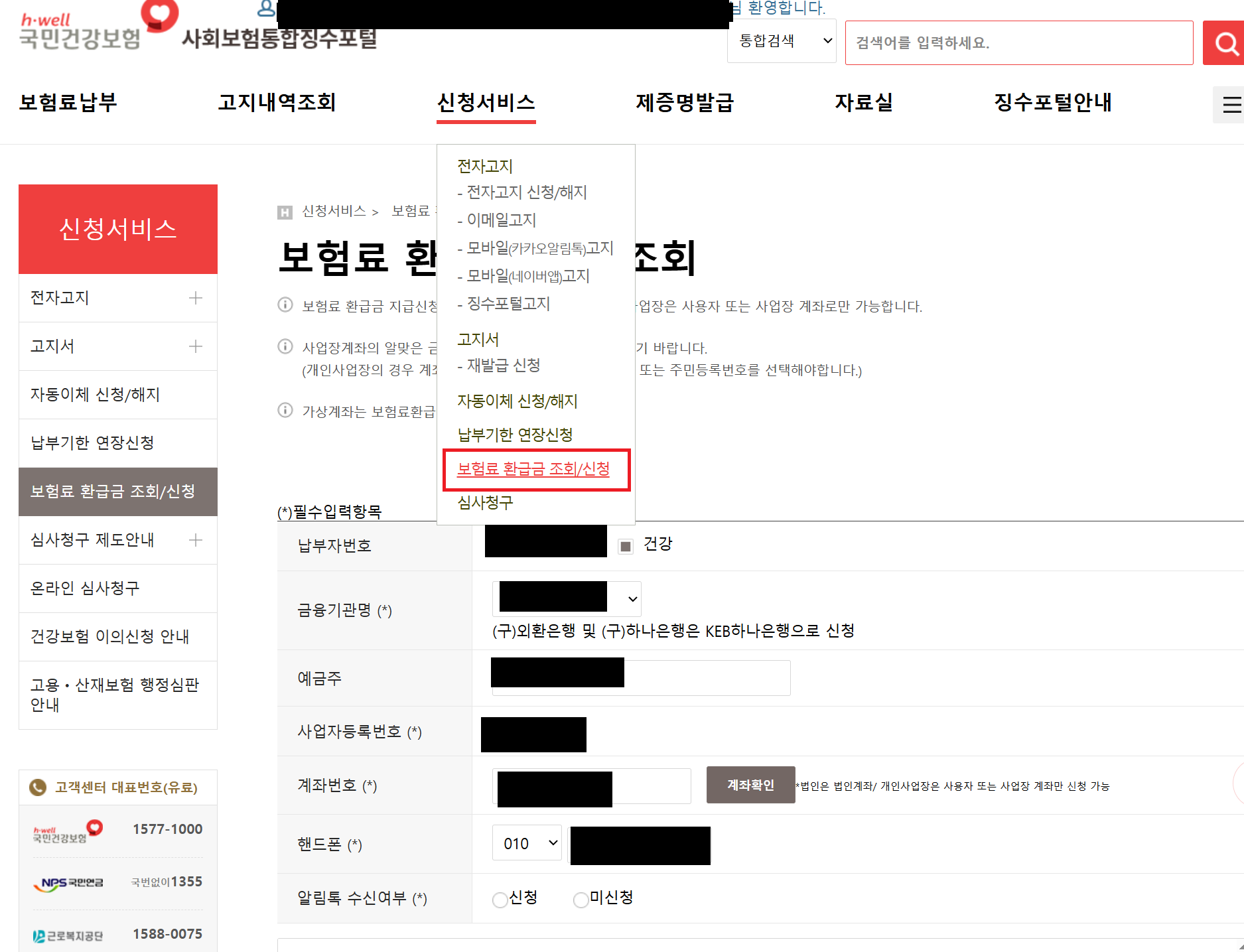 1.사회보험징수포탈 사이트를 들어가서 "보험료 환급금조회/신청"을 눌러주고 -환급내역이 나오면
